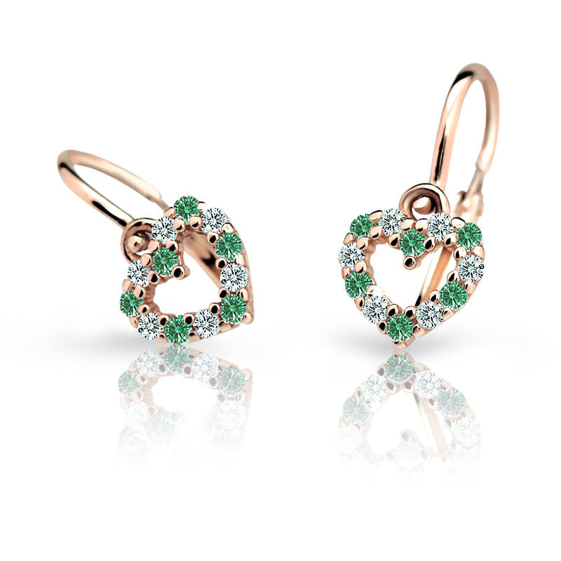 Detské náušnice Danfil srdiečka C2157 zo ružového zlata, Emerald Green, zapínanie brizura