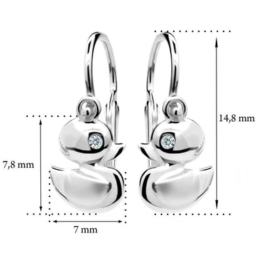 Roztomilé detské náušničky v tvare kačičky vyrobené z 14 karátového bieleho zlata, sú doplnené 2 krásnymi briliantmi okrúhleho brusu o celkovej váhe 0.01 ct zasadenými tak, že tvoria očko kačičky. Hlavička a krídelko majú lesklý povrch, telíčko a zobáčik sú matného vzhľadu a tvoria tak originálny detail. Zapínanie brizura je ideálnou voľbou pre bábätká. Náušničky sú balené v pôvabnej darčekovej krabičke.