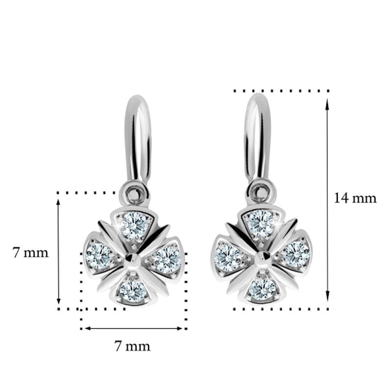 Detské náušničky v tvare klasik so zapínaním typu brizúra sú vyrobené z bieleho 14k zlata a osadené tmavo zelenými zirkónmi. Zlaté náušnice majú puncovú značku 585/1000 od štátneho puncového úradu. Tento typ zapínania považujeme za jeden z najbezpečnejších a je najvhodnejší ako prvé náušničky pre bábätko. Všetky rozmery sú podrobne rozkreslené na podpornej fotografii. Ku každým náušničkám je možné vybrať si aj ladiaci prívesok s retiazkou.