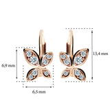 Detské náušničky v tvare motýlika so zapínaním typu klapka sú vyrobené z ružového 14k zlata a osadené bielymi kamienkami. Zlaté náušnice majú puncovú značku 585/1000 od štátneho puncového úradu. Tento typ zapínania považujeme za jeden z najbezpečnejších a je najvhodnejší pre malé slečny vo veku od cca 5 rokov. Na tento typ zapínania je možné za príplatok umiestniť bezpečnosťou poistky. Všetky rozmery sú podrobne rozkreslené na podpornej fotografii. Ku každým náušničkám je možné vybrať si aj ladiaci prívesok s retiazkou.