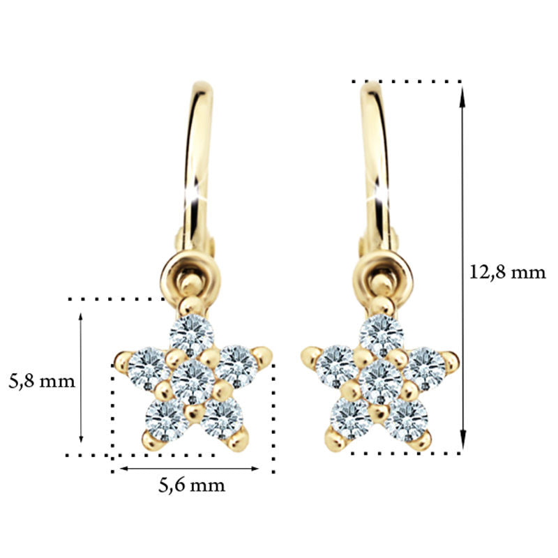 Detské náušničky v tvare hviezdičky so zapínaním typu brizúra sú vyrobené z žltého 14k zlata a osadené tmavo modrými kamienkami. Zlaté náušnice majú puncovú značku 585/1000 od štátneho puncového úradu. Tento typ zapínania považujeme za jeden z najbezpečnejších a je najvhodnejší ako prvé náušničky pre bábätko. Všetky rozmery sú podrobne rozkreslené na podpornej fotografii. Ku každým náušničkám je možné vybrať si aj ladiaci prívesok s retiazkou.