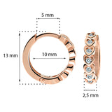Detské náušničky krúžky sú tvorené radom srdiečok so striedajúcimi sa farbami zirkónov v bielej a svetlo ružovej farbe a sú vyrobené z ružového 14 k zlata. Zlaté náušnice majú puncovú značku 585/1000 od štátneho puncového úradu. Tento typ zapínania je veľmi pohodlný na nosenie a je vhodný pre dievčatká cca vo veku od 6 rokov. Všetky rozmery sú podrobne rozkreslené na podpornej fotografii. Ku každým náušničkám je možné vybrať si aj ladiaci prívesok s retiazkou.