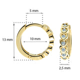 Detské náušničky krúžky sú tvorené radom srdiečok so striedajúcimi sa farbami kamienkov v bielej a žltej farbe a sú vyrobené z žltého 14 k zlata. Zlaté náušnice majú puncovú značku 585/1000 od štátneho puncového úradu. Tento typ zapínania je veľmi pohodlný na nosenie a je vhodný pre dievčatká cca vo veku od 6 rokov. Všetky rozmery sú podrobne rozkreslené na podpornej fotografii. Ku každým náušničkám je možné vybrať si aj ladiaci prívesok s retiazkou.