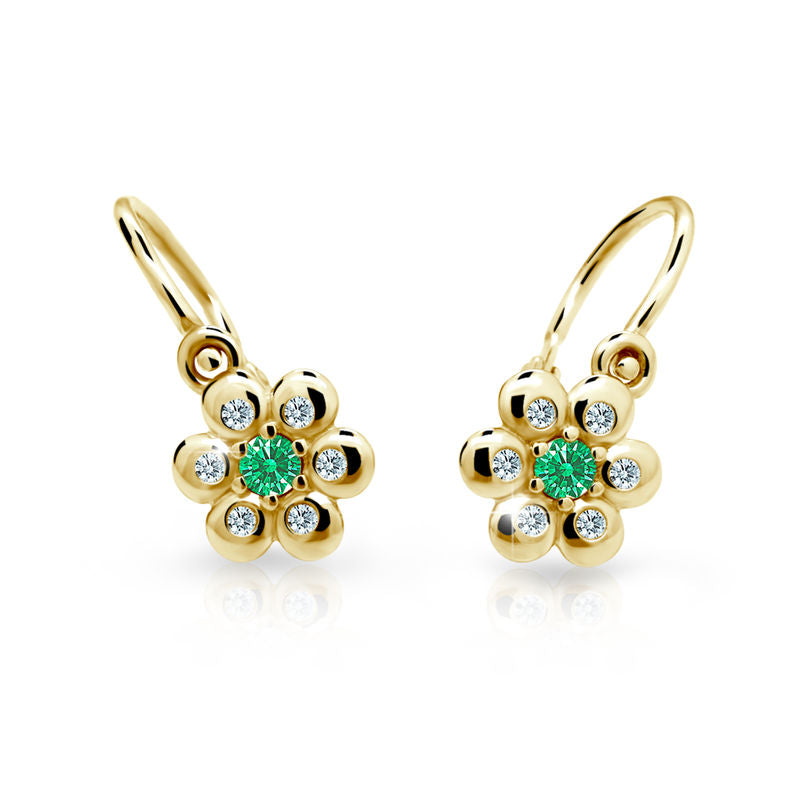 Detské náušničky Danfil kytičky C2247 zo žltého zlata s kamienkom Emerald Green