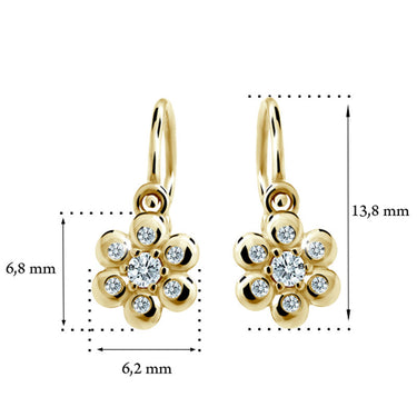 Detské náušničky v tvare kvetinky so zapínaním typu brizúra sú vyrobené z žltého 14k zlata a osadené tmavo zelenými zirkónmi. Zlaté náušnice majú puncovú značku 585/1000 od štátneho puncového úradu. Tento typ zapínania považujeme za jeden z najbezpečnejších a je najvhodnejší ako prvé náušničky pre bábätko. Všetky rozmery sú podrobne rozkreslené na podpornej fotografii. Ku každým náušničkám je možné vybrať si aj ladiaci prívesok s retiazkou.
