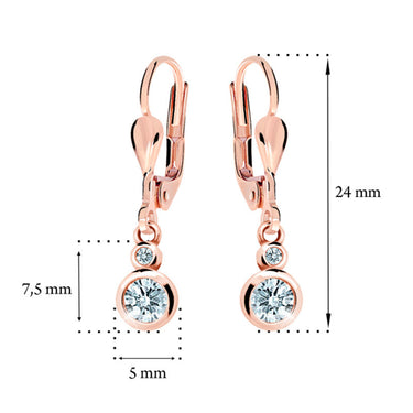 Detské náušničky v tvare klasik so zapínaním typu visacia klapka sú vyrobené z ružového 14 k zlata a osadené svetlo ružovými zirkónmi. Zlaté náušnice majú puncovú značkou 585/1000 od štátneho puncového úradu. Tento typ zapínania považujeme za jeden z najbezpečnejších. Na tento typ zapínania je možné za príplatok umiestniť bezpečnosťou poistky. Všetky rozmery sú podrobne rozkreslené na podpornej fotografii. Ku každým náušničkám je možné vybrať si aj ladiaci prívesok s retiazkou.