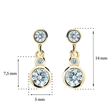 Detské náušničky v tvare klasik so zapínaním typu visací balónik sú vyrobené z žltého 14 k zlata a osadené bielymi zirkónmi. Zlaté náušnice majú puncovú značkou 585/1000 od štátneho puncového úradu. Tento typ zapínania považujeme za jeden z najbezpečnejších. Všetky rozmery sú podrobne rozkreslené na podpornej fotografii. Ku každým náušničkám je možné vybrať si aj ladiaci prívesok s retiazkou.
