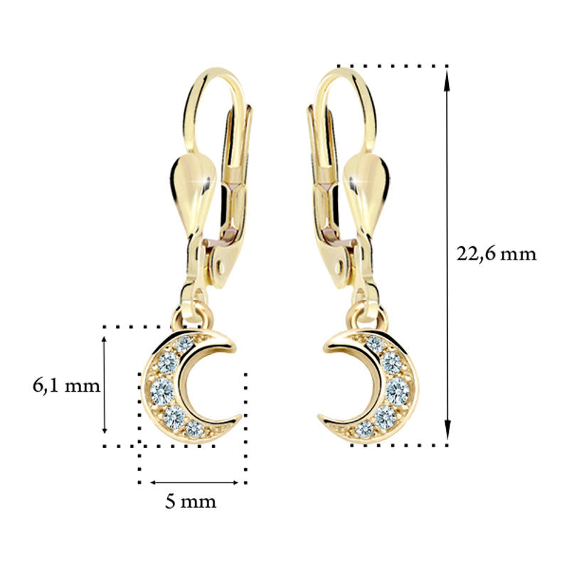 Detské náušničky v tvare klasik so zapínaním typu visacia klapka sú vyrobené z žltého 14 k zlata a osadené bielymi zirkónmi. Zlaté náušnice majú puncovú značkou 585/1000 od štátneho puncového úradu. Tento typ zapínania považujeme za jeden z najbezpečnejších. Na tento typ zapínania je možné za príplatok umiestniť bezpečnosťou poistky. Všetky rozmery sú podrobne rozkreslené na podpornej fotografii. Ku každým náušničkám je možné vybrať si aj ladiaci prívesok s retiazkou.