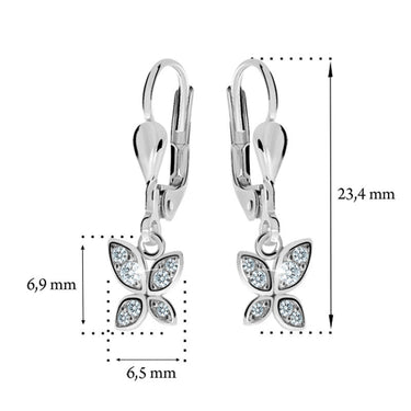 Detské náušničky v tvare motýlika so zapínaním typu visacia klapka sú vyrobené z bieleho 14 k zlata a osadené bielymi zirkónmi. Zlaté náušnice majú puncovú značkou 585/1000 od štátneho puncového úradu. Tento typ zapínania považujeme za jeden z najbezpečnejších. Na tento typ zapínania je možné za príplatok umiestniť bezpečnosťou poistky. Všetky rozmery sú podrobne rozkreslené na podpornej fotografii. Ku každým náušničkám je možné vybrať si aj ladiaci prívesok s retiazkou.