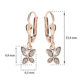 Detské náušničky v tvare motýlika so zapínaním typu visacia klapka sú vyrobené z ružového 14 k zlata a osadené svetlo ružovými kamienkami. Zlaté náušnice majú puncovú značkou 585/1000 od štátneho puncového úradu. Tento typ zapínania považujeme za jeden z najbezpečnejších. Na tento typ zapínania je možné za príplatok umiestniť bezpečnosťou poistky. Všetky rozmery sú podrobne rozkreslené na podpornej fotografii. Ku každým náušničkám je možné vybrať si aj ladiaci prívesok s retiazkou.