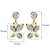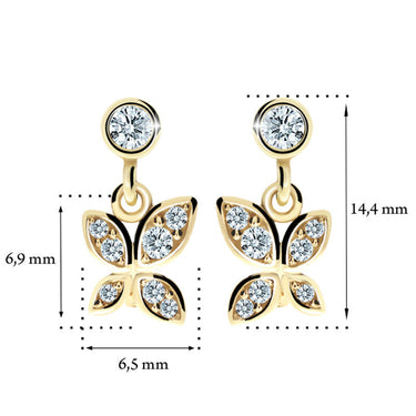 Detské náušničky v tvare motýlika so zapínaním typu visací balónik sú vyrobené z žltého 14 k zlata a osadené svetlo ružovými kamienkami. Zlaté náušnice majú puncovú značkou 585/1000 od štátneho puncového úradu. Tento typ zapínania považujeme za jeden z najbezpečnejších. Všetky rozmery sú podrobne rozkreslené na podpornej fotografii. Ku každým náušničkám je možné vybrať si aj ladiaci prívesok s retiazkou.