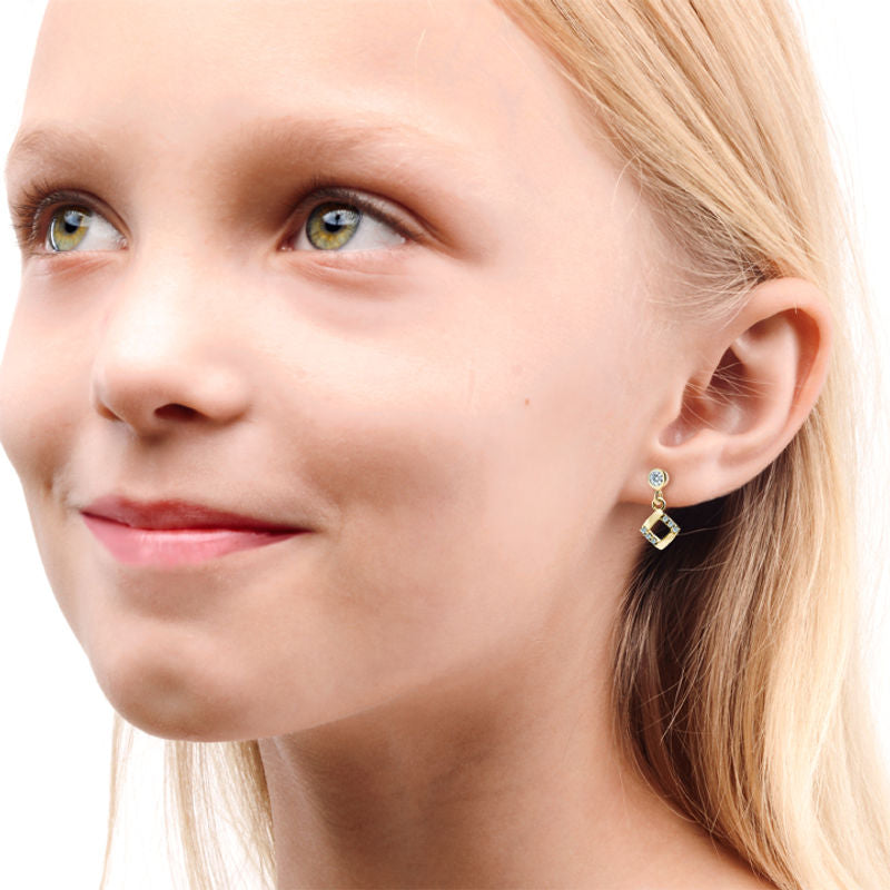 Detské náušničky v tvare klasik so zapínaním typu visacia puzeta sú vyrobené z žltého 14 k zlata a osadené bielymi kamienkami. Zlaté náušnice majú puncovú značkou 585/1000 od štátneho puncového úradu. Tento typ zapínania považujeme za jeden z najbezpečnejších. Všetky rozmery sú podrobne rozkreslené na podpornej fotografii. Ku každým náušničkám je možné vybrať si aj ladiaci prívesok s retiazkou.