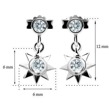 Detské náušničky v tvare hviezdičky so zapínaním typu visacia puzeta sú vyrobené z bieleho 14 k zlata a osadené svetlo ružovými kamienkami. Zlaté náušnice majú puncovú značkou 585/1000 od štátneho puncového úradu. Tento typ zapínania považujeme za jeden z najbezpečnejších. Všetky rozmery sú podrobne rozkreslené na podpornej fotografii. Ku každým náušničkám je možné vybrať si aj ladiaci prívesok s retiazkou.