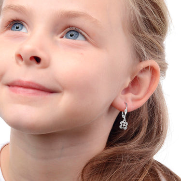 Detské náušničky v tvare kvetinky so zapínaním typu visacia klapka sú vyrobené z bieleho 14 k zlata a osadené bielymi zirkónmi. Zlaté náušnice majú puncovú značkou 585/1000 od štátneho puncového úradu. Tento typ zapínania považujeme za jeden z najbezpečnejších. Na tento typ zapínania je možné za príplatok umiestniť bezpečnosťou poistky. Všetky rozmery sú podrobne rozkreslené na podpornej fotografii. Ku každým náušničkám je možné vybrať si aj ladiaci prívesok s retiazkou.