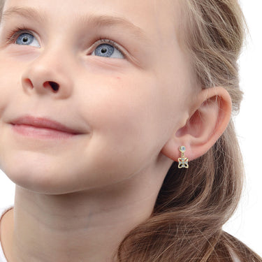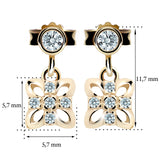 Detské náušničky v tvare kvetinky so zapínaním typu visacia puzeta sú vyrobené z žltého 14 k zlata a osadené bielymi kamienkami. Zlaté náušnice majú puncovú značkou 585/1000 od štátneho puncového úradu. Tento typ zapínania považujeme za jeden z najbezpečnejších. Všetky rozmery sú podrobne rozkreslené na podpornej fotografii. Ku každým náušničkám je možné vybrať si aj ladiaci prívesok s retiazkou.