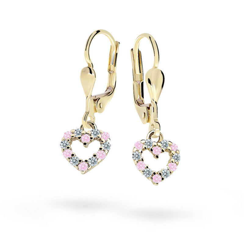 Detské visiace náušnice Danfil srdiečka C2157 zo žltého zlata, Pink, zapínanie klapka