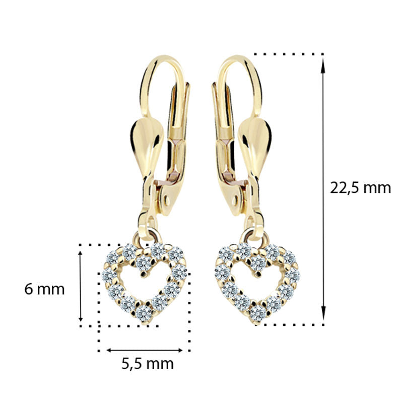 Detské náušničky v tvare srdiečka so zapínaním typu visacia klapka sú vyrobené z žltého 14 k zlata a osadené svetlo ružovými zirkónmi. Zlaté náušnice majú puncovú značkou 585/1000 od štátneho puncového úradu. Tento typ zapínania považujeme za jeden z najbezpečnejších. Na tento typ zapínania je možné za príplatok umiestniť bezpečnosťou poistky. Všetky rozmery sú podrobne rozkreslené na podpornej fotografii. Ku každým náušničkám je možné vybrať si aj ladiaci prívesok s retiazkou.