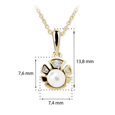 Originálne detský prívesok vyrobený zo 14 karátového žltého zlata, osadený riečne perlou a priezračne bielymi kamienkami, vyniká svojím nadčasovým dizajnom a dokreslí pôvab každej malej slečny. Prívesok je zabalený v pôvabnej darčekovej krabičke v tvare pyramídky.