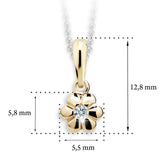 Detský prívesok v tvare kvetinky je vyrobený z žltého 14 k zlata a osadený světlo modrými zirkónmi. Všetky rozmery sú podrobne rozkreslené na podpornej fotografii. Ku každému prívesku je možné vybrať si zlatú retiazku alebo ladiace náušničky do súpravy.