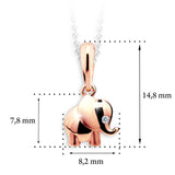 Detský prívesok v tvare slona je vyrobený z ružového 14 k zlata. Zlatý prívesok má puncovú značku 585/1000 od štátneho puncového úradu. Prívesok má v sebe zasadený číry kamienok. Všetky rozmery sú podrobne rozkreslené na podpornej fotografii. Ku každému prívesku je možné vybrať si zlatú retiazku alebo ladiace náušničky do súpravy.