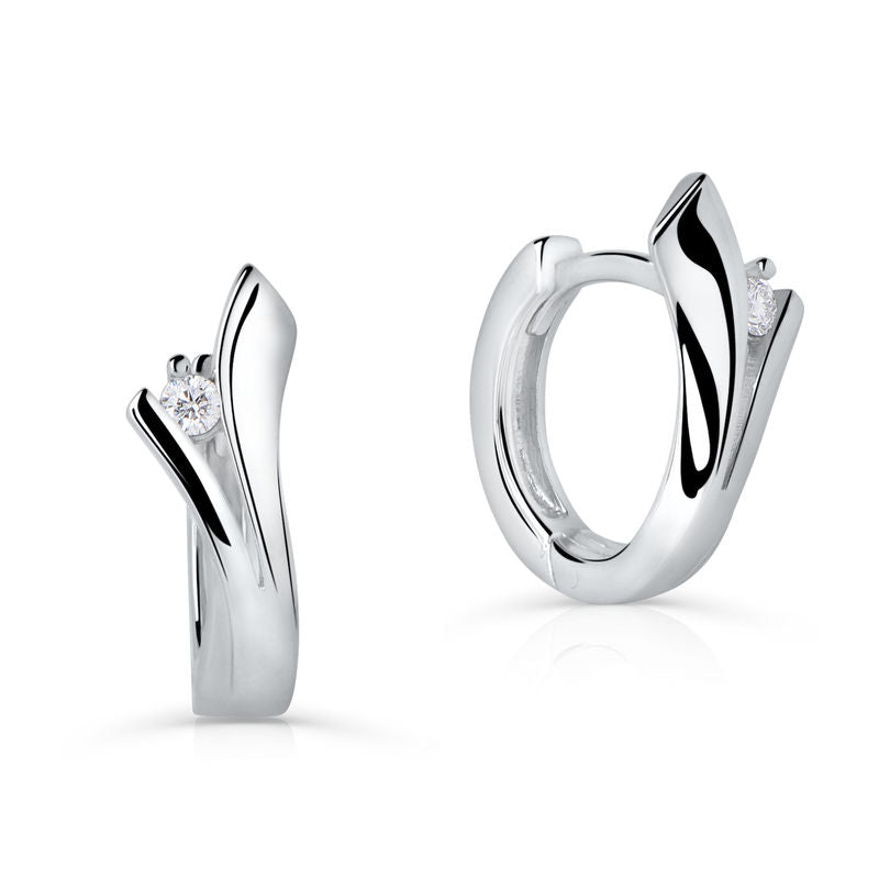Krásne náušnice kruhového tvaru z bieleho 14 karátového zlata, osadené 0.064 ct krásnymi diamantmi okrúhleho brusu. Tieto náušnice majú snehovo biely povrch v kombinácii lesklého a matného prevedenie. Šperk je uložený v luxusnej darčekovej krabičke spolu s certifikátom pravosti.