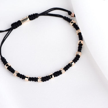 Dámsky šnúrkový náramok je tvorený střídajími sa komponenty diamantových a celozlatých oblých valčekov s detailne spracovanými uzlíky. Zapínanie je riešené praktickým predlžovacím a skracovacím mechanizmom pre obvod zápästia od 15 do 20cm. Zlaté komponenty sú vyrobené z ružového 14k 585/1000 zlata. Na valčekoch je umiestnené celkom 40 briliantov o celkovej váhe 0,16ct. Náramok dorazí uložený v luxusnej krabičke spolu s certifikátom pravosti.