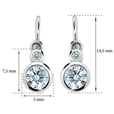 Detské náušničky v tvare klasik so zapínaním typu brizúra sú vyrobené z bieleho 14k zlata a osadené svetlo modrými zirkónmi. Zlaté náušnice majú puncovú značku 585/1000 od štátneho puncového úradu. Tento typ zapínania považujeme za jeden z najbezpečnejších a je najvhodnejší ako prvé náušničky pre bábätko. Všetky rozmery sú podrobne rozkreslené na podpornej fotografii. Ku každým náušničkám je možné vybrať si aj ladiaci prívesok s retiazkou.