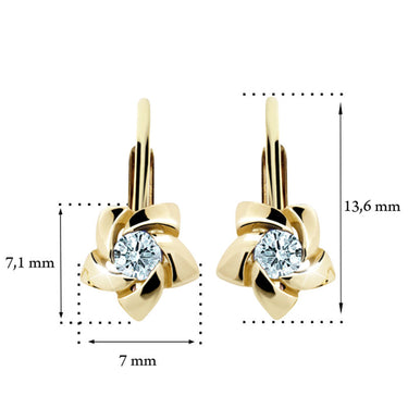 Detské náušničky v tvare klasik so zapínaním typu klapka sú vyrobené z žltého 14k zlata a osadené fialovými zirkónmi. Zlaté náušnice majú puncovú značku 585/1000 od štátneho puncového úradu. Tento typ zapínania považujeme za jeden z najbezpečnejších a je najvhodnejší pre malé slečny vo veku od cca 5 rokov. Na tento typ zapínania je možné za príplatok umiestniť bezpečnosťou poistky. Všetky rozmery sú podrobne rozkreslené na podpornej fotografii. Ku každým náušničkám je možné vybrať si aj ladiaci prívesok s retiazkou.