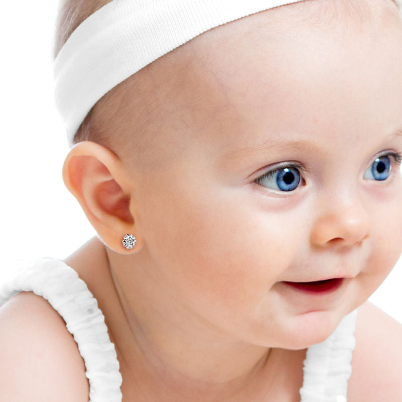 Detské náušničky v tvare kvetinky so zapínaním typu puzeta sú vyrobené z bieleho 14k zlata a osadené svetlo modrými kamienkami. Zlaté náušnice majú puncovú značku 585/1000 od štátneho puncového úradu. Tento typ zapínania považujeme za jeden z najbezpečnejších a je najvhodnejší pre dievčatká od 6 mesiacov. Všetky rozmery sú podrobne rozkreslené na podpornej fotografii. Ku každým náušničkám je možné vybrať si aj ladiaci prívesok s retiazkou.