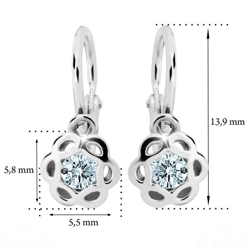 Detské náušničky v tvare kvetinky so zapínaním typu brizúra sú vyrobené z bieleho 14k zlata a osadené tmavo modrými zirkónmi. Zlaté náušnice majú puncovú značku 585/1000 od štátneho puncového úradu. Tento typ zapínania považujeme za jeden z najbezpečnejších a je najvhodnejší ako prvé náušničky pre bábätko. Všetky rozmery sú podrobne rozkreslené na podpornej fotografii. Ku každým náušničkám je možné vybrať si aj ladiaci prívesok s retiazkou.