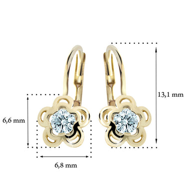 Detské náušničky v tvare kvetinky so zapínaním typu klapka sú vyrobené z žltého 14k zlata a osadené fialovými zirkónmi. Zlaté náušnice majú puncovú značku 585/1000 od štátneho puncového úradu. Tento typ zapínania považujeme za jeden z najbezpečnejších a je najvhodnejší pre malé slečny vo veku od cca 5 rokov. Na tento typ zapínania je možné za príplatok umiestniť bezpečnosťou poistky. Všetky rozmery sú podrobne rozkreslené na podpornej fotografii. Ku každým náušničkám je možné vybrať si aj ladiaci prívesok s retiazkou.