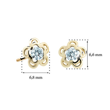 Detské náušničky v tvare kvetinky so zapínaním typu balónik sú vyrobené z žltého 14k zlata a osadené tmavo modrými zirkónmi. Zapínanie je vhodné až od 6 mesiacov. Všetky rozmery sú podrobne rozkreslené na podpornej fotografii. Ku každým náušničkám je možné vybrať si aj ladiaci prívesok s retiazkou.