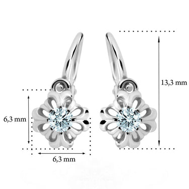 Detské náušničky v tvare kvetinky so zapínaním typu brizúra sú vyrobené z bieleho 14k zlata a osadené tmavo modrými zirkónmi. Zlaté náušnice majú puncovú značku 585/1000 od štátneho puncového úradu. Tento typ zapínania považujeme za jeden z najbezpečnejších a je najvhodnejší ako prvé náušničky pre bábätko. Všetky rozmery sú podrobne rozkreslené na podpornej fotografii. Ku každým náušničkám je možné vybrať si aj ladiaci prívesok s retiazkou.