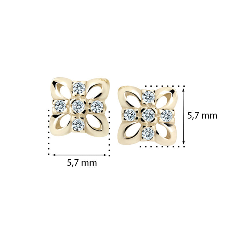 Detské náušničky v tvare kvetinky so zapínaním typu puzeta sú vyrobené z žltého 14k zlata a osadené svetlo modrými zirkónmi. Zlaté náušnice majú puncovú značku 585/1000 od štátneho puncového úradu. Tento typ zapínania považujeme za jeden z najbezpečnejších a je najvhodnejší pre dievčatká od 6 mesiacov. Všetky rozmery sú podrobne rozkreslené na podpornej fotografii. Ku každým náušničkám je možné vybrať si aj ladiaci prívesok s retiazkou.