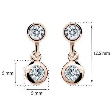 Detské náušničky v tvare klasik so zapínaním typu visacia puzeta sú vyrobené z ružového 14 k zlata a osadené svetlo modrými zirkónmi. Zlaté náušnice majú puncovú značkou 585/1000 od štátneho puncového úradu. Tento typ zapínania považujeme za jeden z najbezpečnejších. Všetky rozmery sú podrobne rozkreslené na podpornej fotografii. Ku každým náušničkám je možné vybrať si aj ladiaci prívesok s retiazkou.