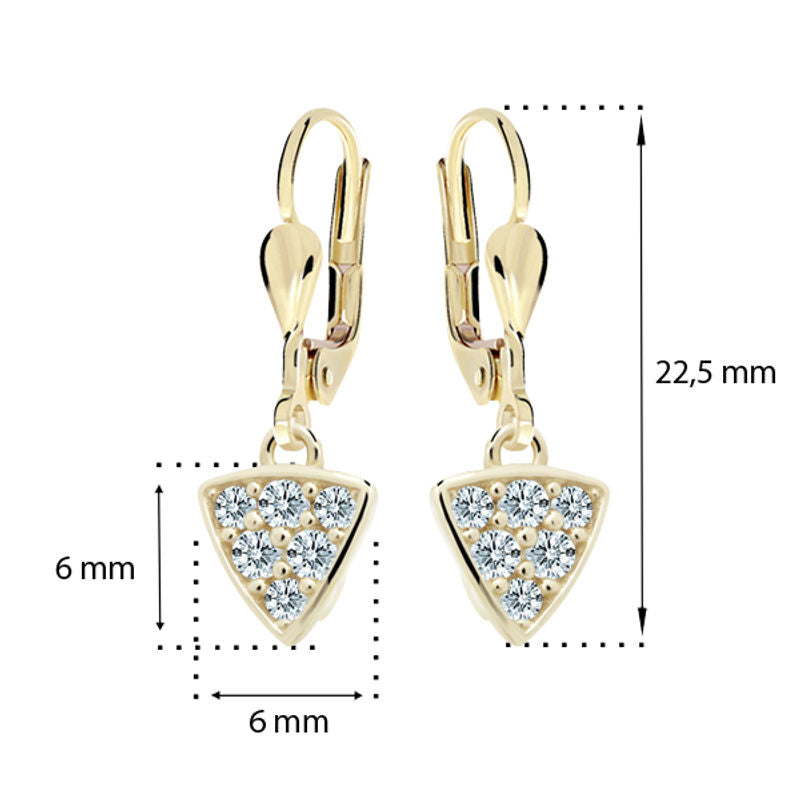 Detské náušničky v tvare klasik so zapínaním typu visacia klapka sú vyrobené z žltého 14 k zlata a osadené fialovými zirkónmi. Zlaté náušnice majú puncovú značkou 585/1000 od štátneho puncového úradu. Tento typ zapínania považujeme za jeden z najbezpečnejších. Na tento typ zapínania je možné za príplatok umiestniť bezpečnosťou poistky. Všetky rozmery sú podrobne rozkreslené na podpornej fotografii. Ku každým náušničkám je možné vybrať si aj ladiaci prívesok s retiazkou.