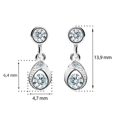 Detské náušničky v tvare kvapky so zapínaním typu visací balónik sú vyrobené z bieleho 14 k zlata a osadené tmavo modrými zirkónmi. Zlaté náušnice majú puncovú značkou 585/1000 od štátneho puncového úradu. Tento typ zapínania považujeme za jeden z najbezpečnejších. Všetky rozmery sú podrobne rozkreslené na podpornej fotografii. Ku každým náušničkám je možné vybrať si aj ladiaci prívesok s retiazkou.