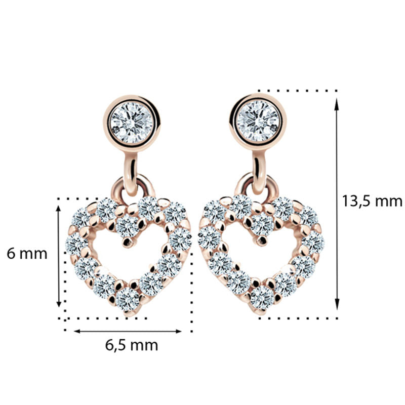 Detské náušničky v tvare srdiečka so zapínaním typu visací balónik sú vyrobené z ružového 14 k zlata a osadené fialovými zirkónmi. Zlaté náušnice majú puncovú značkou 585/1000 od štátneho puncového úradu. Tento typ zapínania považujeme za jeden z najbezpečnejších. Všetky rozmery sú podrobne rozkreslené na podpornej fotografii. Ku každým náušničkám je možné vybrať si aj ladiaci prívesok s retiazkou.