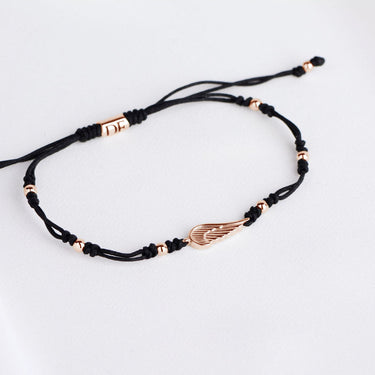 Dámsky zlatý náramok so šnúrkou a anjelským krídlom je doplnený celozlatými guličkami a detailne spracovanými uzlíky. Všetky komponenty sú vyrobené z ružového 14k 585/1000 zlata. Zapínanie je riešené praktickým predlžovacím a skracovacím mechanizmom pre obvod zápästia od 15 do 20cm. Šnúrkový náramok nie je nutné dávať dole na šport ani kúpanie a dorazí uložený v luxusnej darčekovej krabičke.