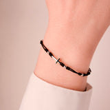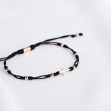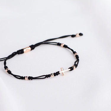 Dámsky zlatý náramok so šnúrkou a krížikom je doplnený celozlatými guličkami a detailne spracovanými uzlíky. Všetky komponenty sú vyrobené z ružového 14k 585/1000 zlata. Zapínanie je riešené praktickým predlžovacím a skracovacím mechanizmom pre obvod zápästia od 15 do 20cm. Šnúrkový náramok nie je nutné dávať dole na šport ani kúpanie a dorazí uložený v luxusnej darčekovej krabičke.
