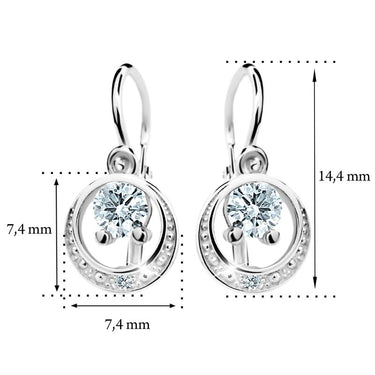 Detské náušničky v tvare klasik so zapínaním typu brizúra sú vyrobené z bieleho 14k zlata a osadené fialovými zirkónmi. Zlaté náušnice majú puncovú značku 585/1000 od štátneho puncového úradu. Tento typ zapínania považujeme za jeden z najbezpečnejších a je najvhodnejší ako prvé náušničky pre bábätko. Všetky rozmery sú podrobne rozkreslené na podpornej fotografii. Ku každým náušničkám je možné vybrať si aj ladiaci prívesok s retiazkou.