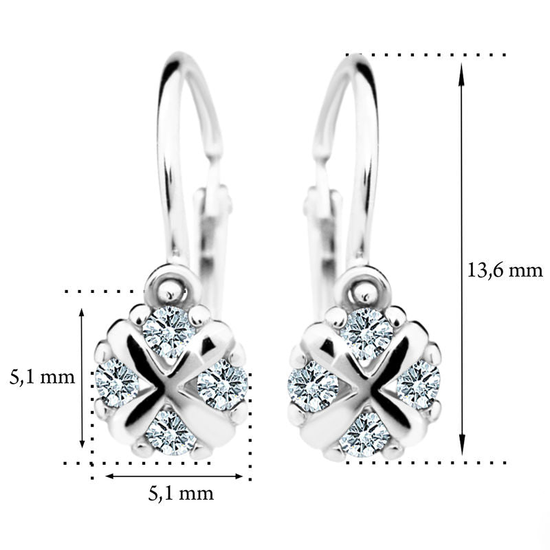 Detské náušničky v tvare klasik so zapínaním typu brizúra sú vyrobené z bieleho 14k zlata a osadené tyrkysovými zirkónmi. Tento typ zapínania považujeme za jeden z najbezpečnejších a je najvhodnejší ako prvé náušničky pre bábätko. Všetky rozmery sú podrobne rozkreslené na podpornej fotografii. Ku každým náušničkám je možné vybrať si aj ladiaci prívesok s retiazkou.
