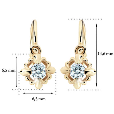 Detské náušničky v tvare klasik so zapínaním typu brizúra sú vyrobené z žltého 14k zlata a osadené tyrkysovými kamienkami. Zlaté náušnice majú puncovú značku 585/1000 od štátneho puncového úradu. Tento typ zapínania považujeme za jeden z najbezpečnejších a je najvhodnejší ako prvé náušničky pre bábätko. Všetky rozmery sú podrobne rozkreslené na podpornej fotografii. Ku každým náušničkám je možné vybrať si aj ladiaci prívesok s retiazkou.