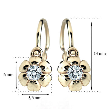 Detské náušničky v tvare kvetinky so zapínaním typu brizúra sú vyrobené z žltého 14k zlata a osadené tyrkysovými zirkónmi. Zlaté náušnice majú puncovú značku 585/1000 od štátneho puncového úradu. Tento typ zapínania považujeme za jeden z najbezpečnejších a je najvhodnejší ako prvé náušničky pre bábätko. Všetky rozmery sú podrobne rozkreslené na podpornej fotografii. Ku každým náušničkám je možné vybrať si aj ladiaci prívesok s retiazkou.