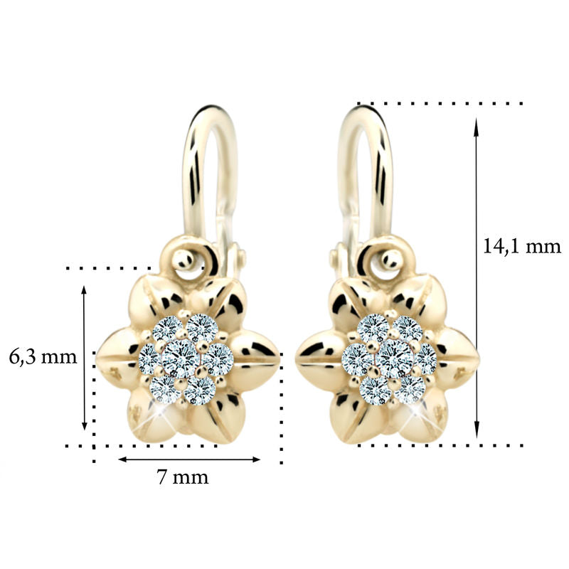 Detské náušničky v tvare kvetinky so zapínaním typu brizúra sú vyrobené z žltého 14k zlata a osadené fialovými kamienkami. Zlaté náušnice majú puncovú značku 585/1000 od štátneho puncového úradu. Tento typ zapínania považujeme za jeden z najbezpečnejších a je najvhodnejší ako prvé náušničky pre bábätko. Všetky rozmery sú podrobne rozkreslené na podpornej fotografii. Ku každým náušničkám je možné vybrať si aj ladiaci prívesok s retiazkou.
