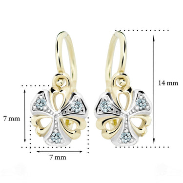 Detské náušničky v tvare kvetinky so zapínaním typu brizúra sú vyrobené z žltého 14k zlata a osadené fialovými zirkónmi. Zlaté náušnice majú puncovú značku 585/1000 od štátneho puncového úradu. Tento typ zapínania považujeme za jeden z najbezpečnejších a je najvhodnejší ako prvé náušničky pre bábätko. Všetky rozmery sú podrobne rozkreslené na podpornej fotografii. Ku každým náušničkám je možné vybrať si aj ladiaci prívesok s retiazkou.