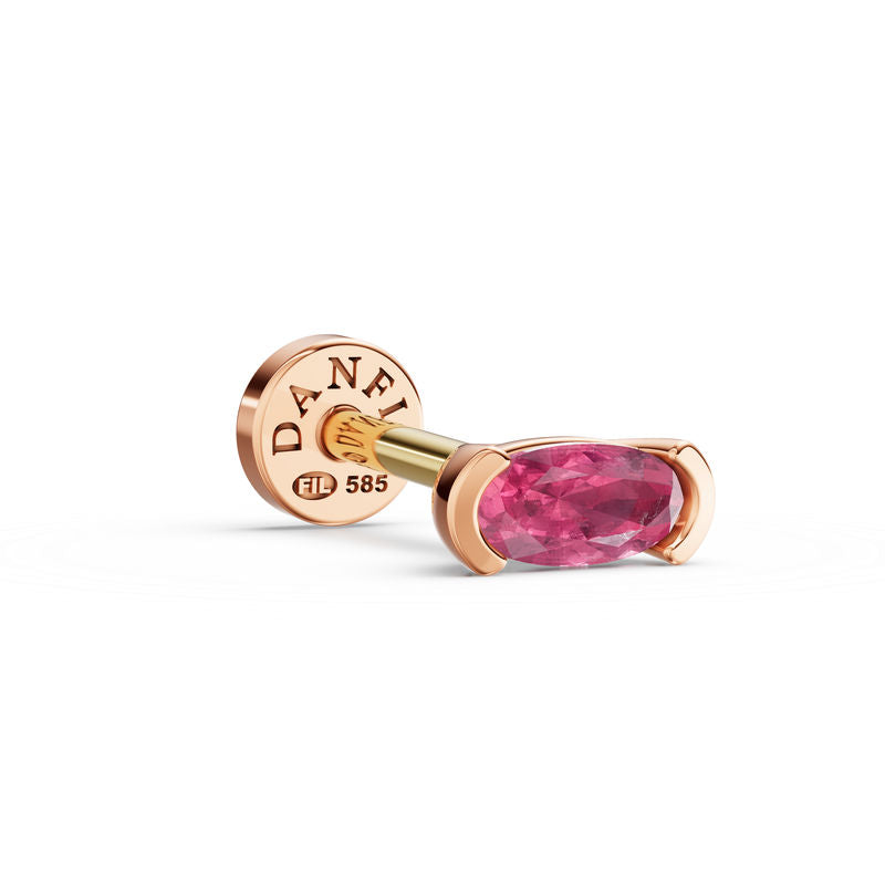 Jemná a ženská piercingová labreta z 14 karátového růžového zlata s vnitřním závitem okouzlí teplým tónem zlata a intenzivní barvou drahokamu. Rubín oválného brusu o váze 0.115 ct dodává šperku elegantní kontrast a luxusní, romantický nádech. Labreta je vhodná pro piercing helix, tragus, lobe, conch a flat a je ideální také pro první aplikaci piercingu. Nadčasový a pohodlný šperk, který se skvěle hodí pro každodenní nošení i kombinování s dalšími piercingy.