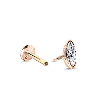 Jemná piercingová labreta z růžového 14 karátového zlata s vnitřním závitem, která je zakončena laboratorně vytvořeným diamantem Marquise brusu o váze 0,123 ct a rozměrech 5 × 2,5 mm. Je vhodná pro typ piercingu helix, tragus, lobe, conch a flat. Tloušťka tyčinky je 1 mm. Šperk lze použít pro první aplikaci piercingu. Součástí šperku je certifikát pravosti.