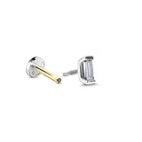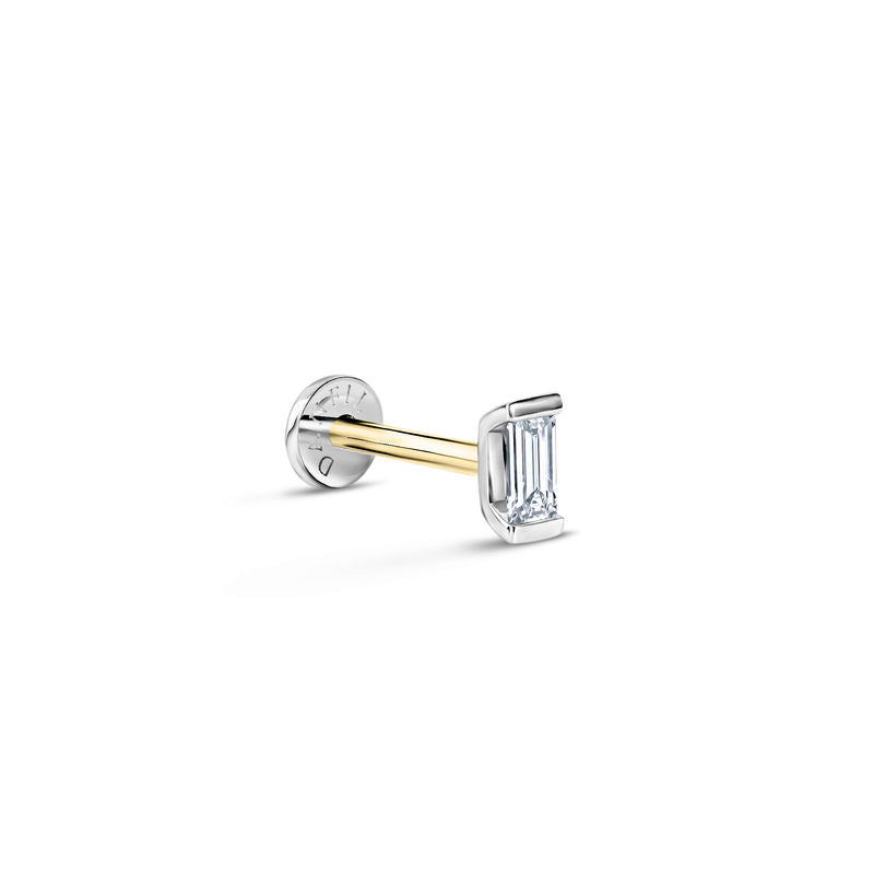 Jemná piercingová labreta z bílého 14 karátového zlata s vnitřním závitem, která je zakončena laboratorně vytvořeným baguette diamantem o váze 0,067 ct a rozměrech 3 × 1,75 mm. Je vhodná pro typ piercingu helix, tragus, lobe, conch a flat. Tloušťka tyčinky je 1 mm. Šperk lze použít pro první aplikaci piercingu. Součástí šperku je certifikát pravosti.