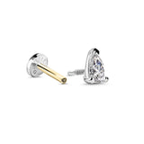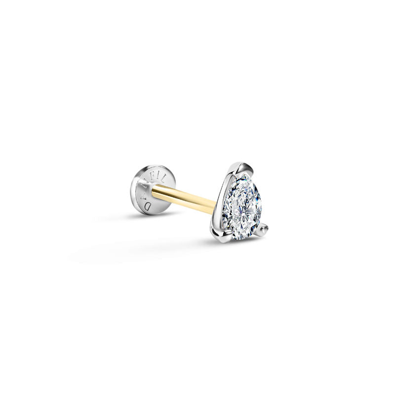 Jemná piercingová labreta z bílého 14 karátového zlata s vnitřním závitem, která je zakončena laboratorně vytvořeným diamantem Pear brusu o váze 0,162 ct a rozměrech 4,5 × 3 mm. Je vhodná pro typ piercingu helix, tragus, lobe, conch a flat. Tloušťka tyčinky je 1 mm. Šperk lze použít pro první aplikaci piercingu. Součástí šperku je certifikát pravosti.